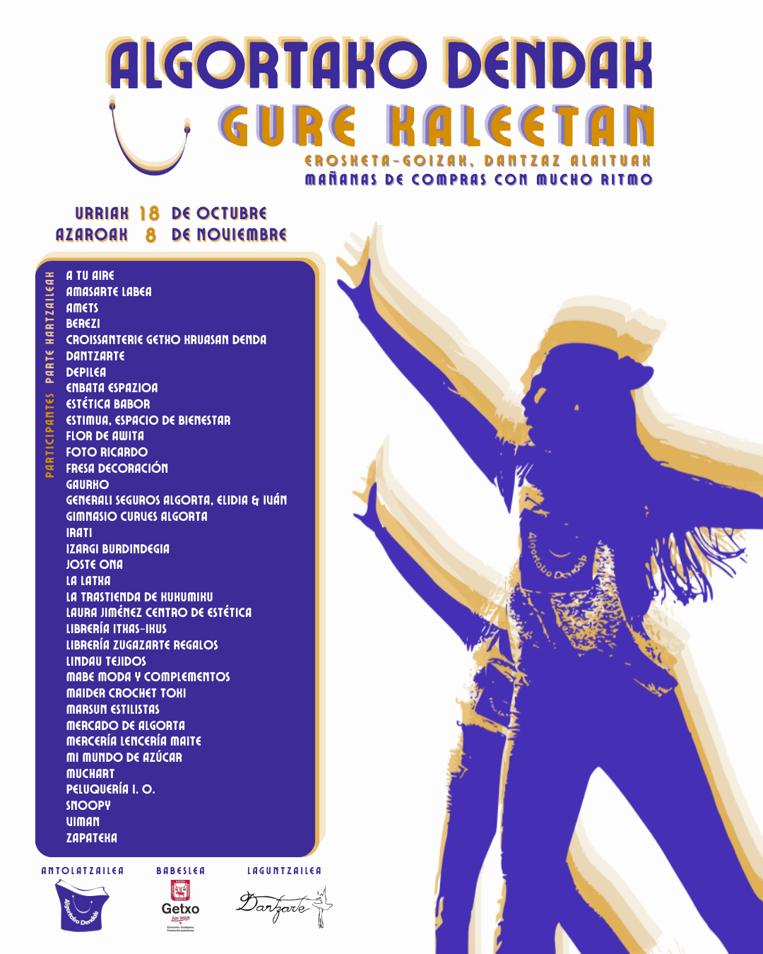 Cerca de 40 establecimientos participarán en esta 5ª edición, en la que las y los bailarines de la academia Dantzarte de Algorta llenarán de música y movimiento las calles de la localidad. Podremos encontrar escaparates vivos con bailarines y bailarinas, pequeñas coreografías con la música más actual y algunas actuaciones en plazas cercanas a los ejes comerciales.